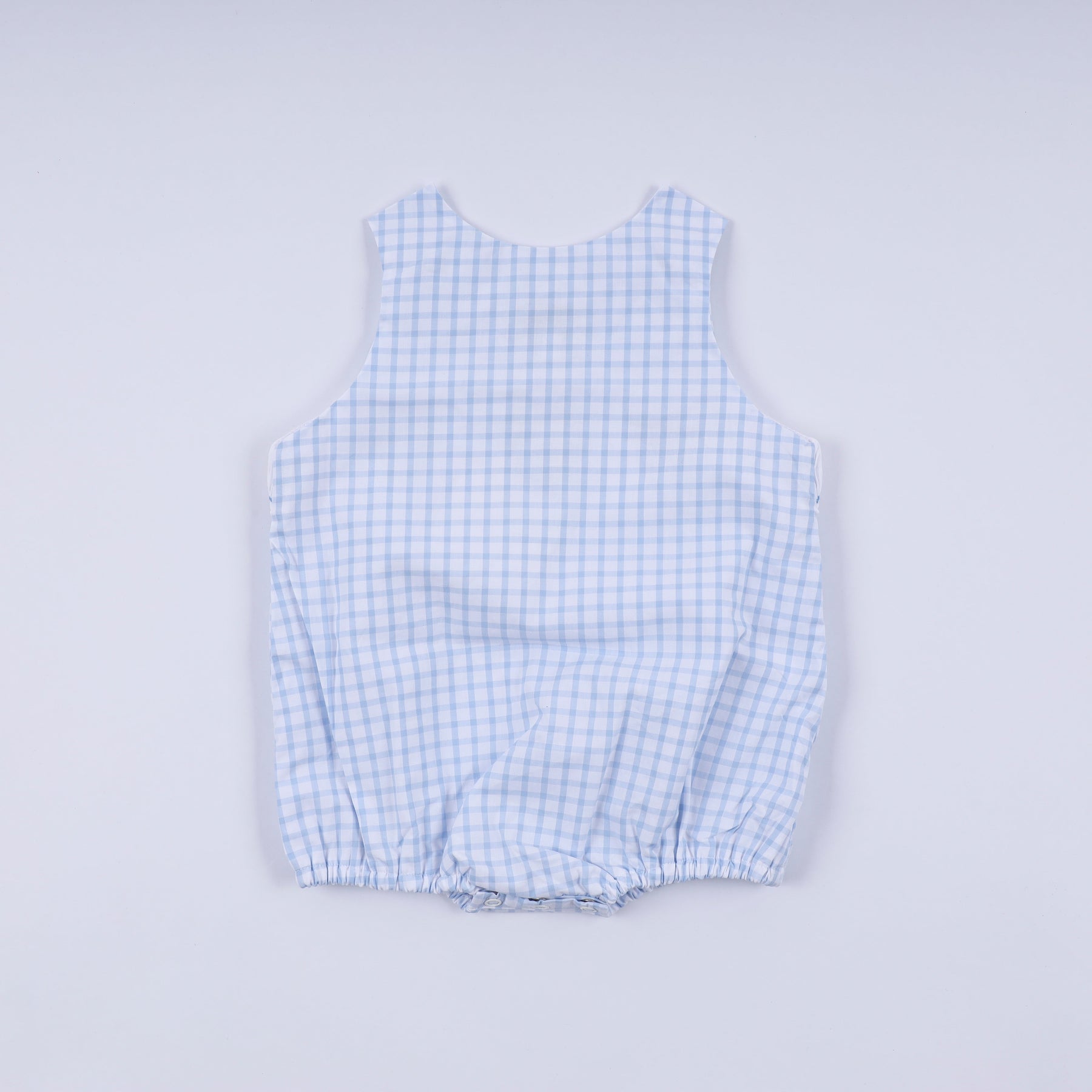 Adorable bubble romper featuring a charming character design set against classic gingham checks. Hand-smocked detailing adds texture and vintage-inspired appeal, while the relaxed bubble silhouette keeps little ones comfortable and stylish. Perfect for playdates, family outings, or everyday wear. The soft blue palette complements any wardrobe, making this a versatile piece that parents and kids will love.