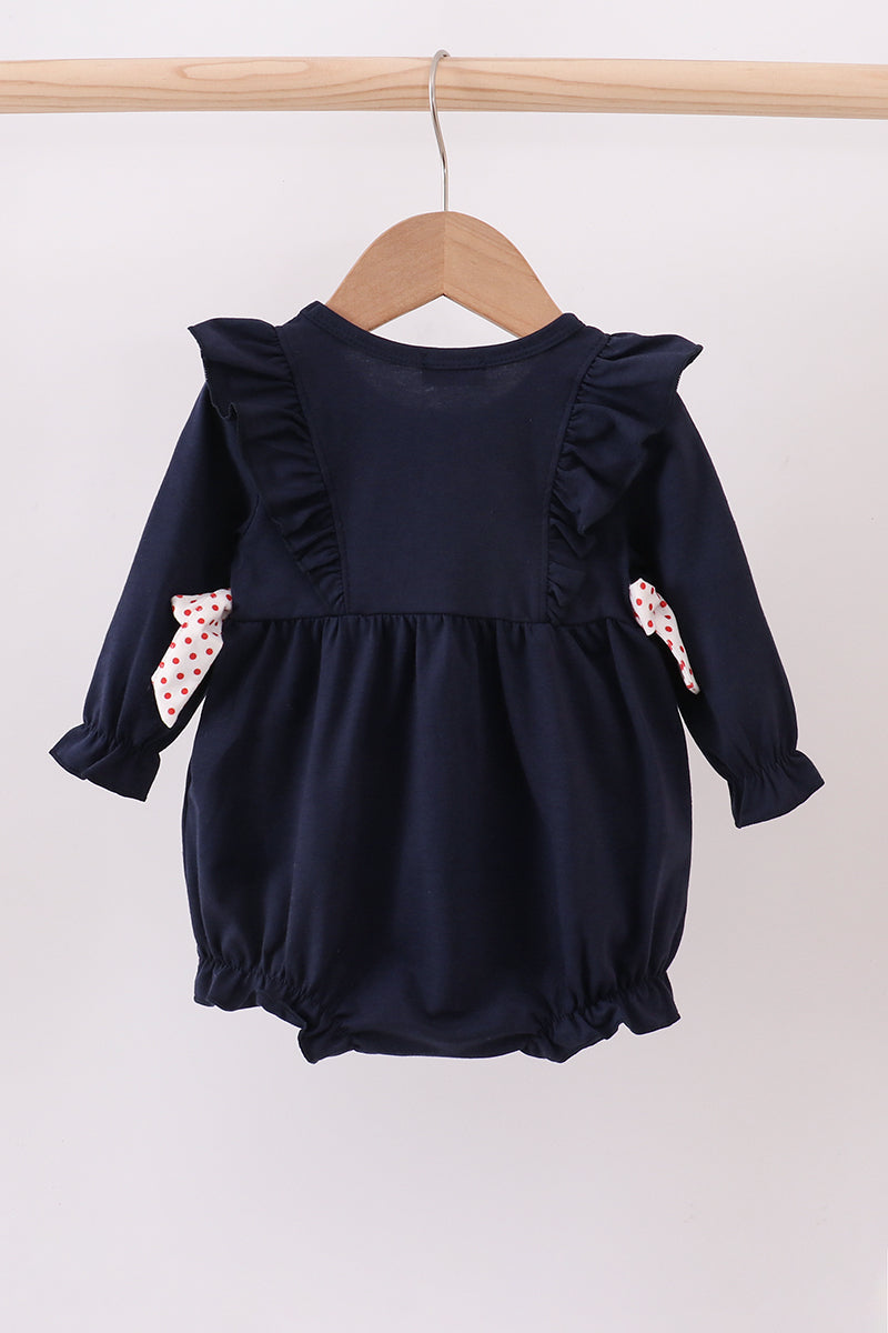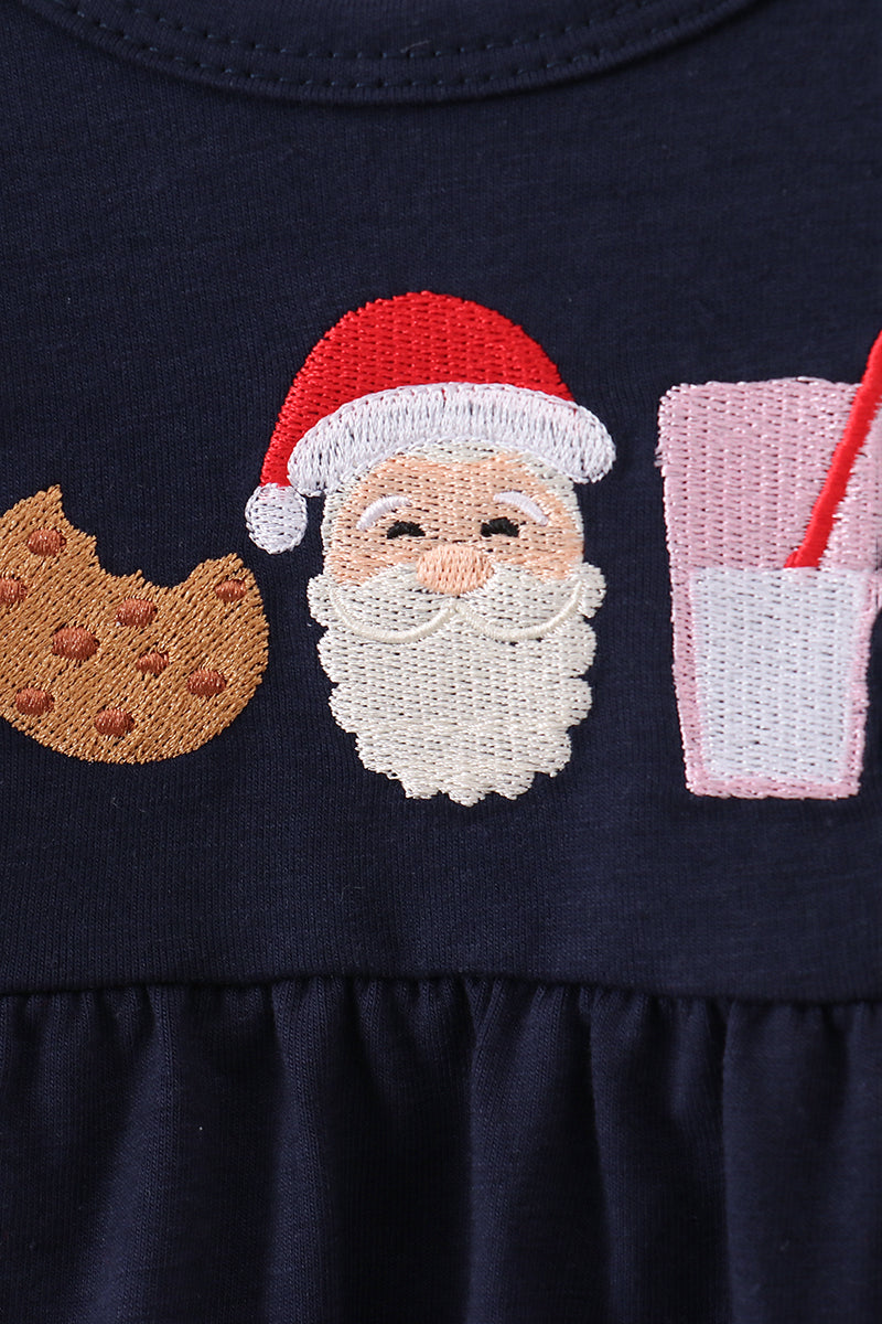 Bring festive cheer to your little one’s wardrobe with this Navy Christmas Santa Cookie Milk Embroidery Ruffle Bubble. Featuring charming embroidered holiday details and playful ruffles, this bubble romper combines comfort with seasonal fun. Perfect for holiday photos or cozy family gatherings, it adds a sweet and joyful touch to any celebration.