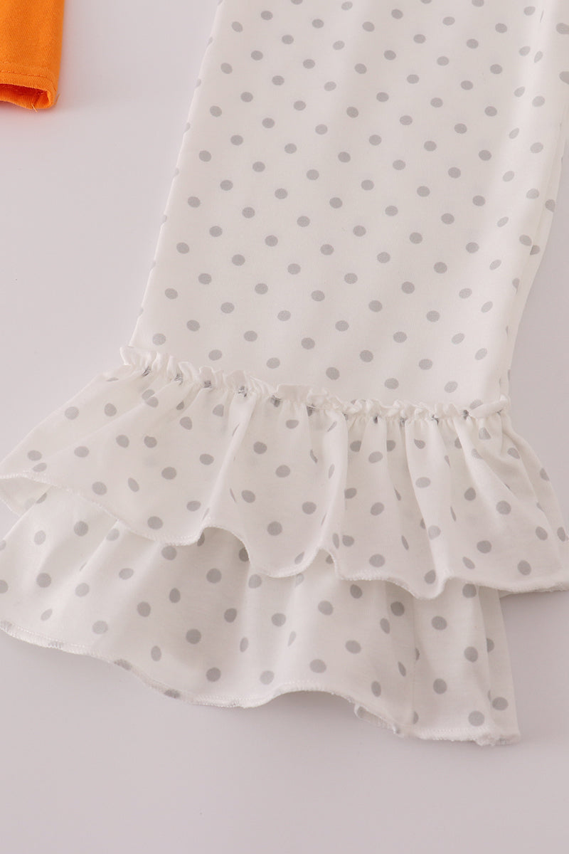 Show your team spirit with this playful Orange Tennessee Go Vols embroidery ruffle pants set. Featuring vibrant orange fabric and charming embroidered details, these pants add a fun, spirited touch to any outfit. The ruffle accents bring a flirty, lively vibe perfect for game days or casual wear. Comfortable and cute, this set lets you cheer on your Vols in style and comfort.