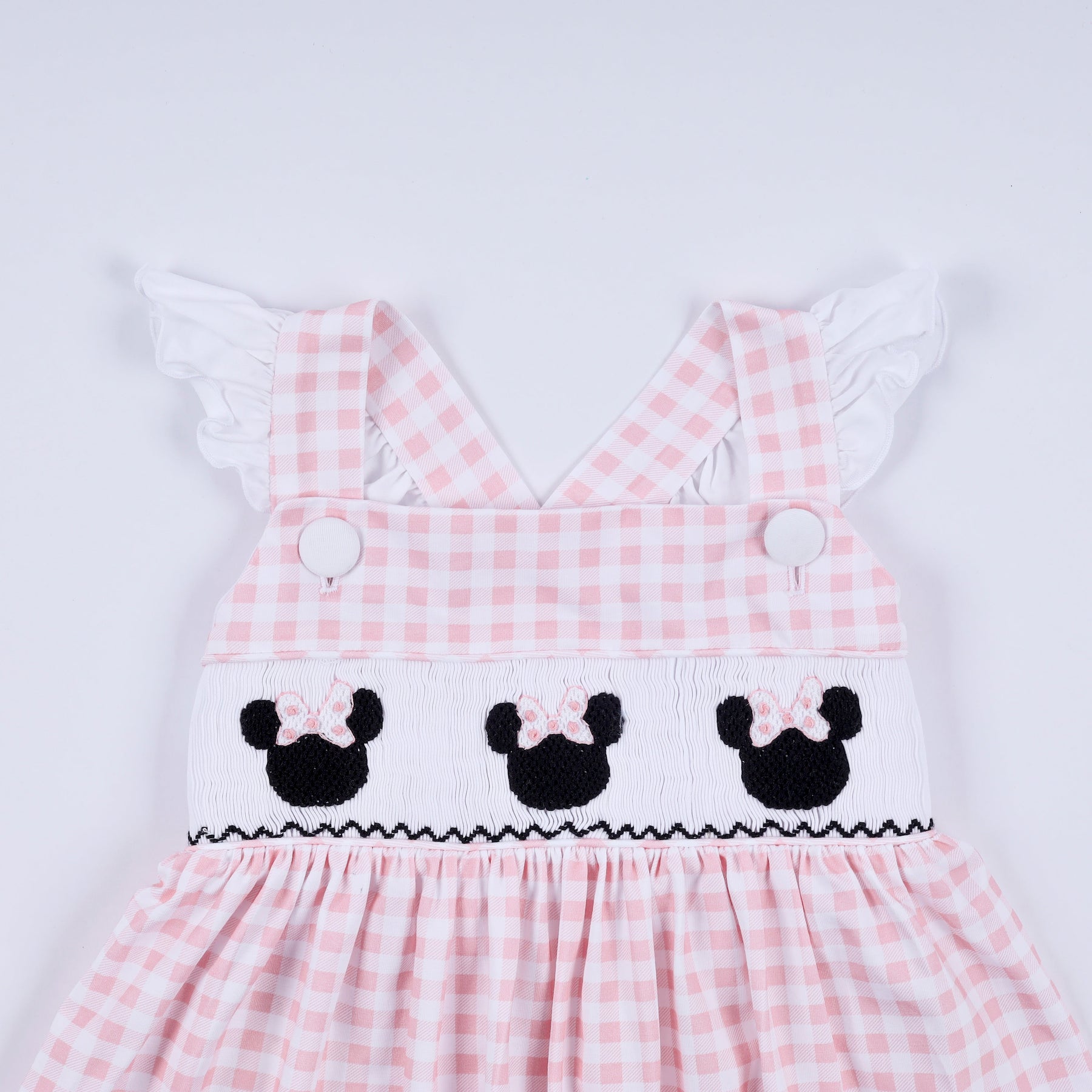 Meet the dress that's as charming as it is twirl-worthy! This pink gingham ruffle dress features adorable character details and hand-smocked craftsmanship that adds texture and personality. The playful ruffles dance with every movement, while the classic gingham pattern keeps things sweet and timeless. Perfect for special occasions or everyday adventures, this dress combines whimsical character charm with quality construction that parents love. A delightful choice for little ones who love to express their unique style.