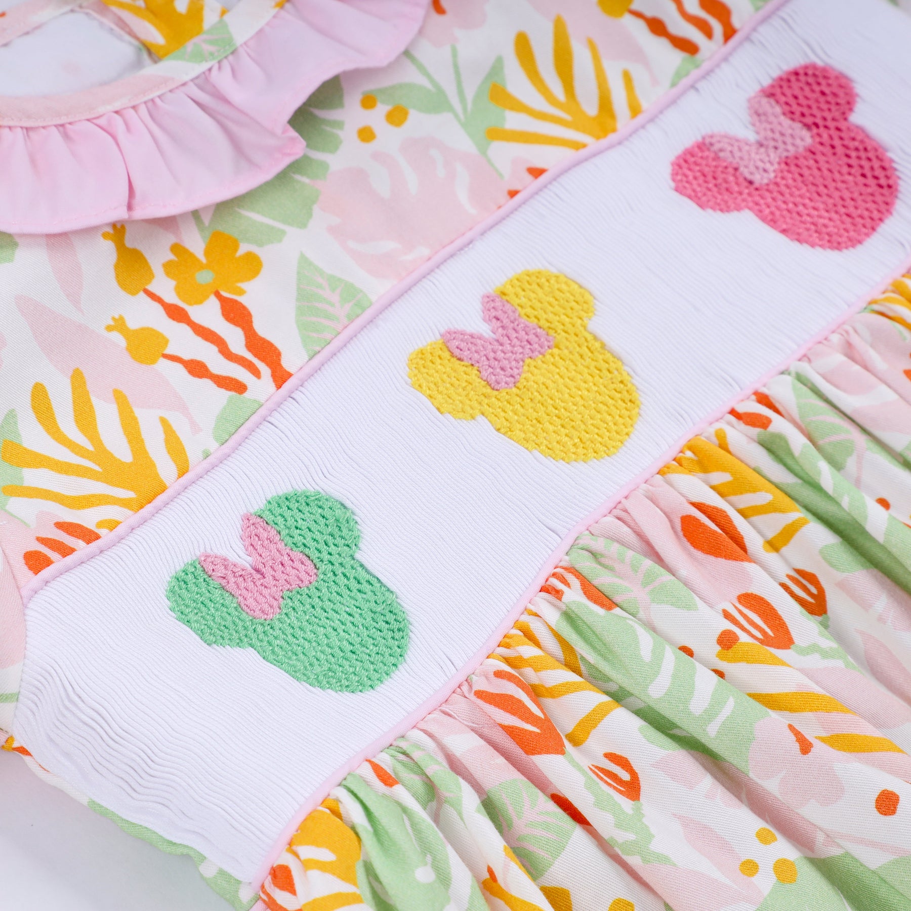 Dress your little one in island-inspired charm with this delightful hand-smocked ruffle pants set. Featuring adorable character details and expertly crafted smocking, each piece celebrates playful style with a touch of tropical flair. The ruffled pants add movement and personality, while the coordinated set ensures effortless dressing. Perfect for warm weather adventures or special occasions, this set combines comfort with whimsical design that kids will love wearing again and again.