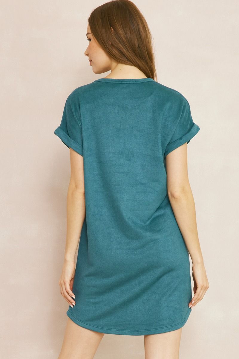 Faux suede short sleeve mini dress featuring pockets at side. Unlined. Woven. Non-sheer. Lightweight.