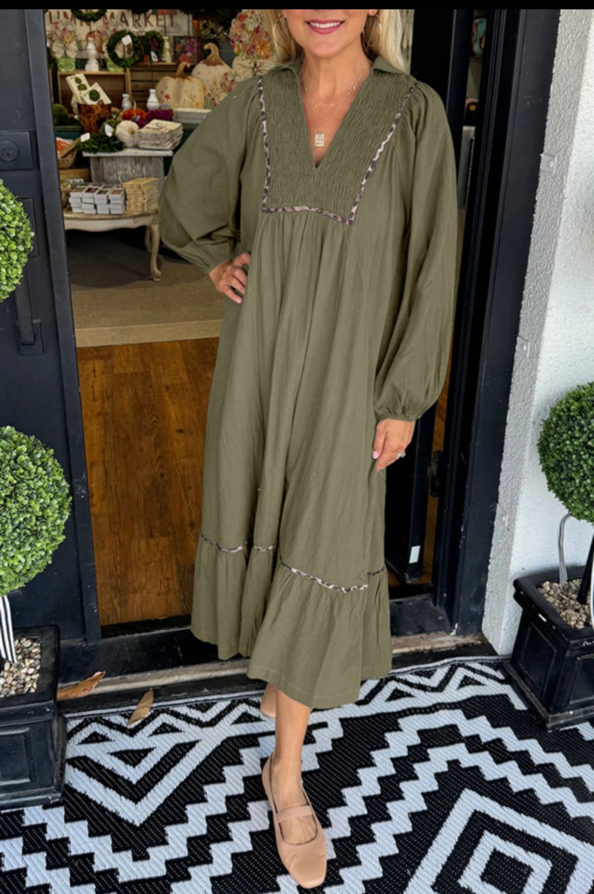Olive Leopard Trim Dress- Preorder