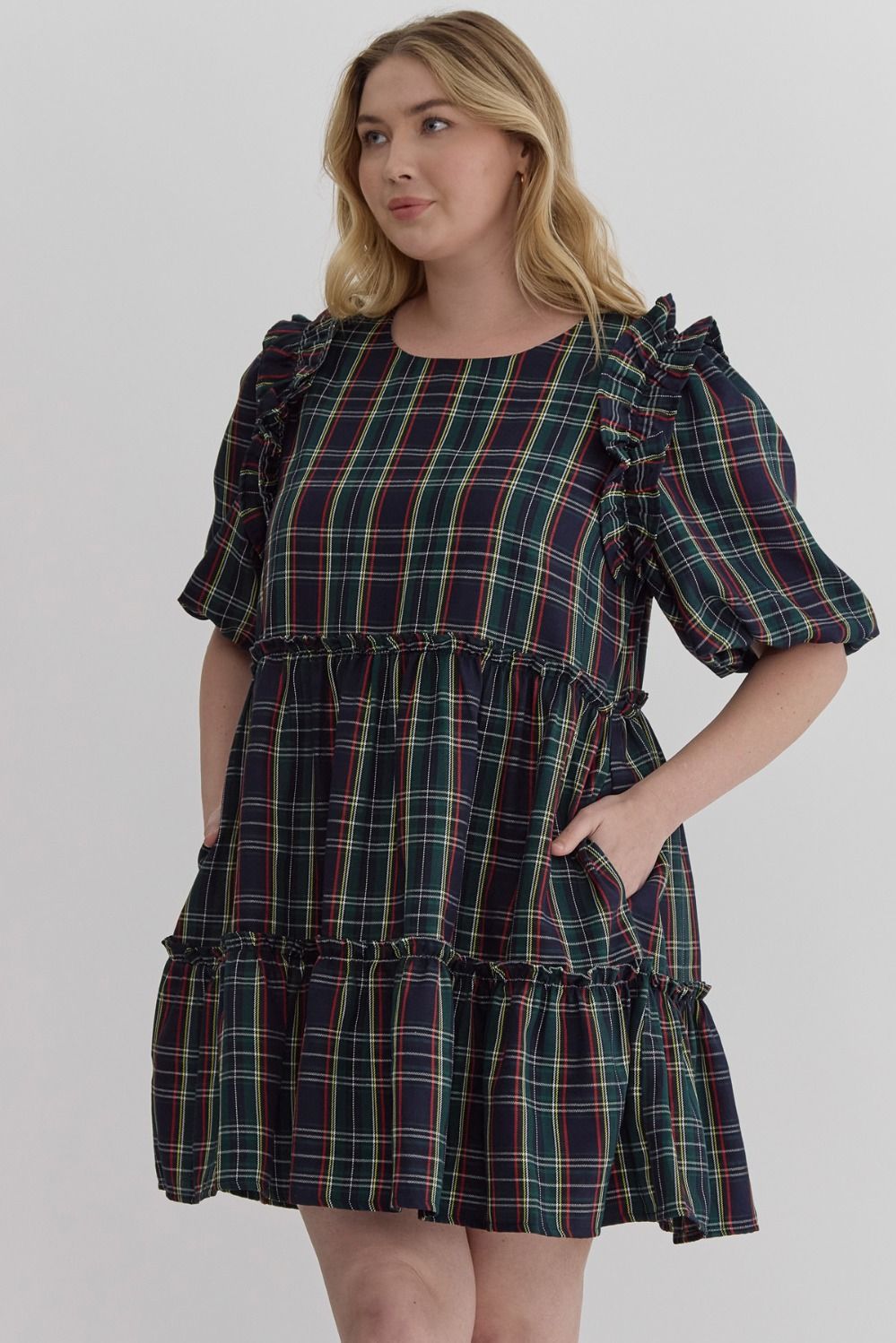 Plaid short sleeve tiered mini dress featuring ruffle trim detail. Puff sleeves. Zipper closure at back. Unlined. Woven. Non-sheer. Lightweight.