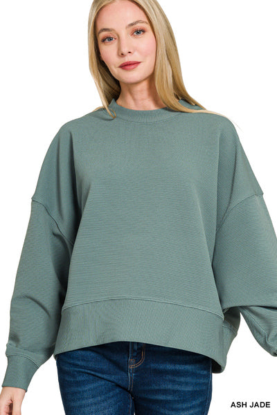 The Ribbed Balloon Sleeve Pullover features a relaxed fit designed for enhanced comfort. This garment allows for freedom of movement, making it suitable for extended wear. The soft ribbed fabric adds a cozy texture, ideal for transitional weather, while also providing breathability.