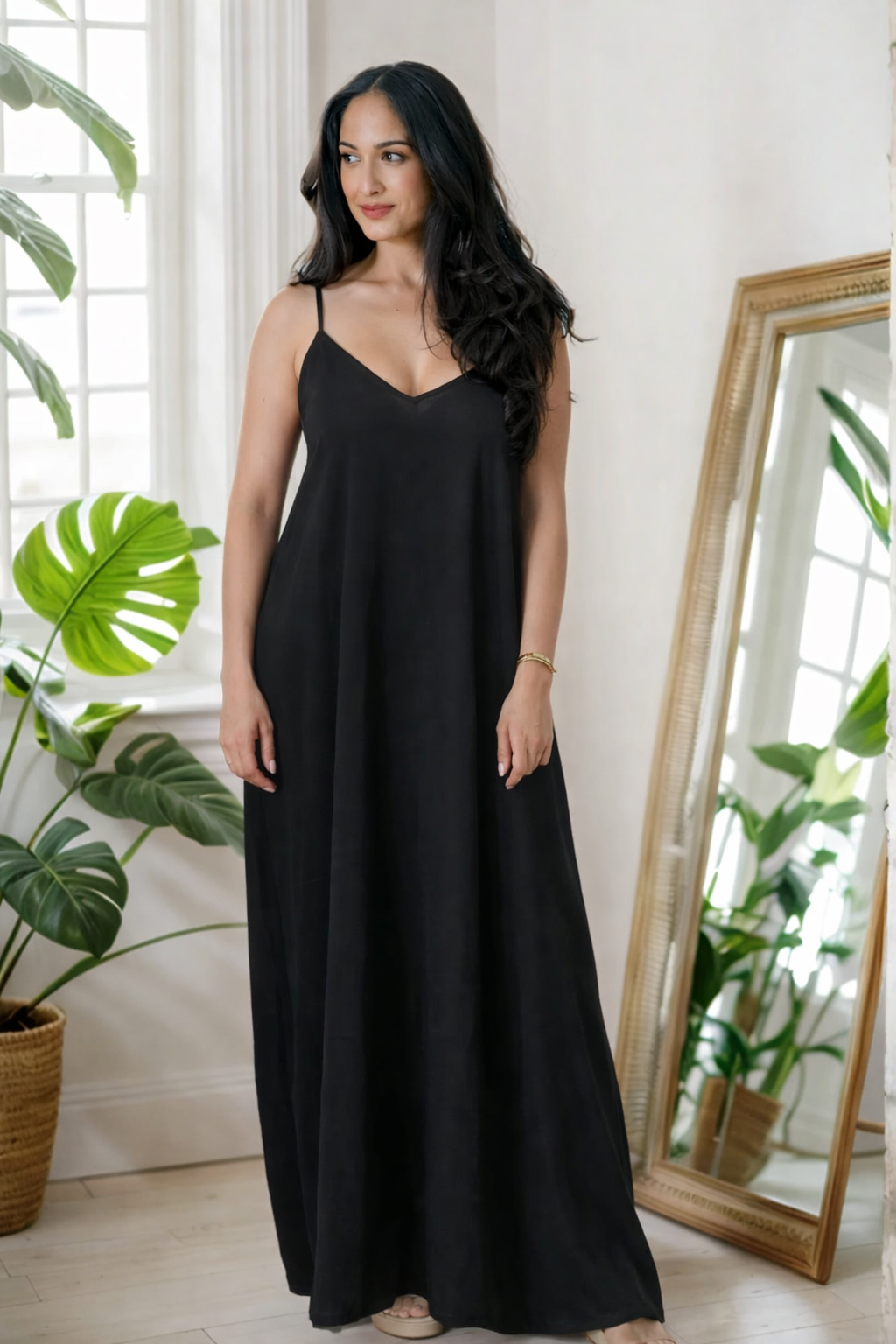 Stay cool and stylish all night long with our Till The Break Of Dawn Maxi! Featuring a flattering v-neck design and adjustable spaghetti straps for the perfect fit. The flowy silhouette and convenient side pockets add an extra touch of comfort, and the lightweight fabric will keep you feeling light and airy. Sleep or lounge in effortless style!